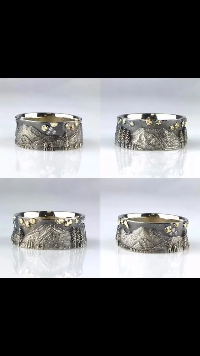 Many of my custom requests are for mountain landscape wedding bands. I’ll have you send me any photos of the places you want me to capture on your wedding bands. For other designs, any styles, motifs, or illustrations you believe will strengthen your communication with me, I encourage you to send them to me.